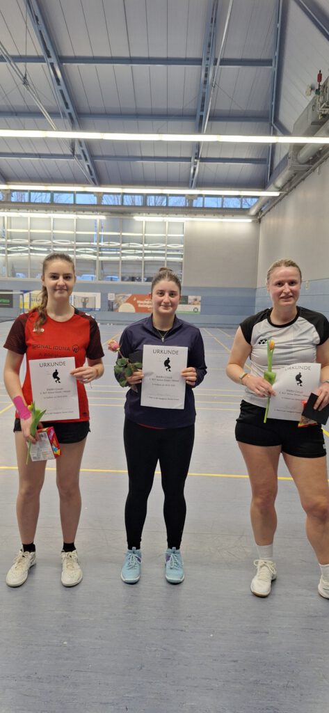 Bei den Dameneinzeln mussten die Klassen ebenfalls zusammengelegt werden. Unter 6 startenden Damen belegte Elifnaz Altin (TSV Löchgau) den 1. Platz vor Janina Poppe (TSG Heilbronn) und Sofie Haas (Fortuna Schwetzingen).