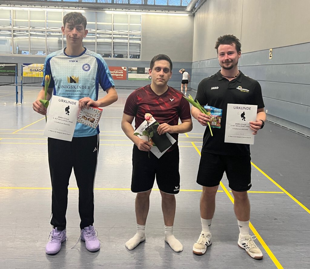 Das Herreneinzel A war mit 14 Meldungen besetzt. Im Finale trafen Ben Seyffert von der SG Schorndorf und Marcus Bayer vom BSV Eggenstein-Leopoldshafen aufeinander. Das Spiel ging in 3 Sätzen an den Schorndorfer. Platz 3 belegte Manuel Beinert (TSG Dossenheim).