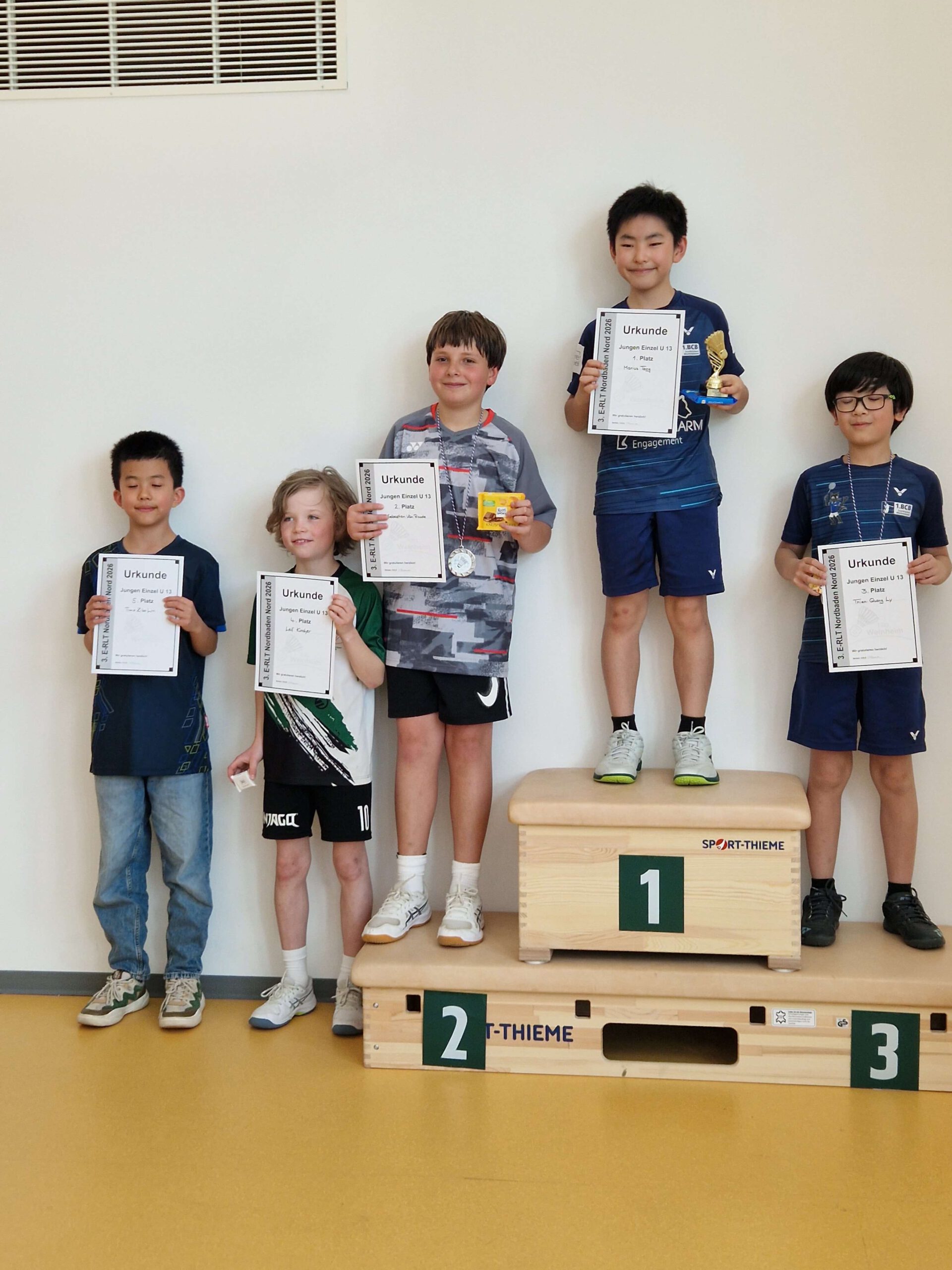 | JE U13 1 Marius Tang 1. BC Sbr.-Bischmisheim 2 Sebastian Van Roode BSpfr. Neusatz 3 Thien-Quang Ly 1. BC Sbr.-Bischmisheim 4 Leif Kircher BSpfr. Neusatz | ![]() |