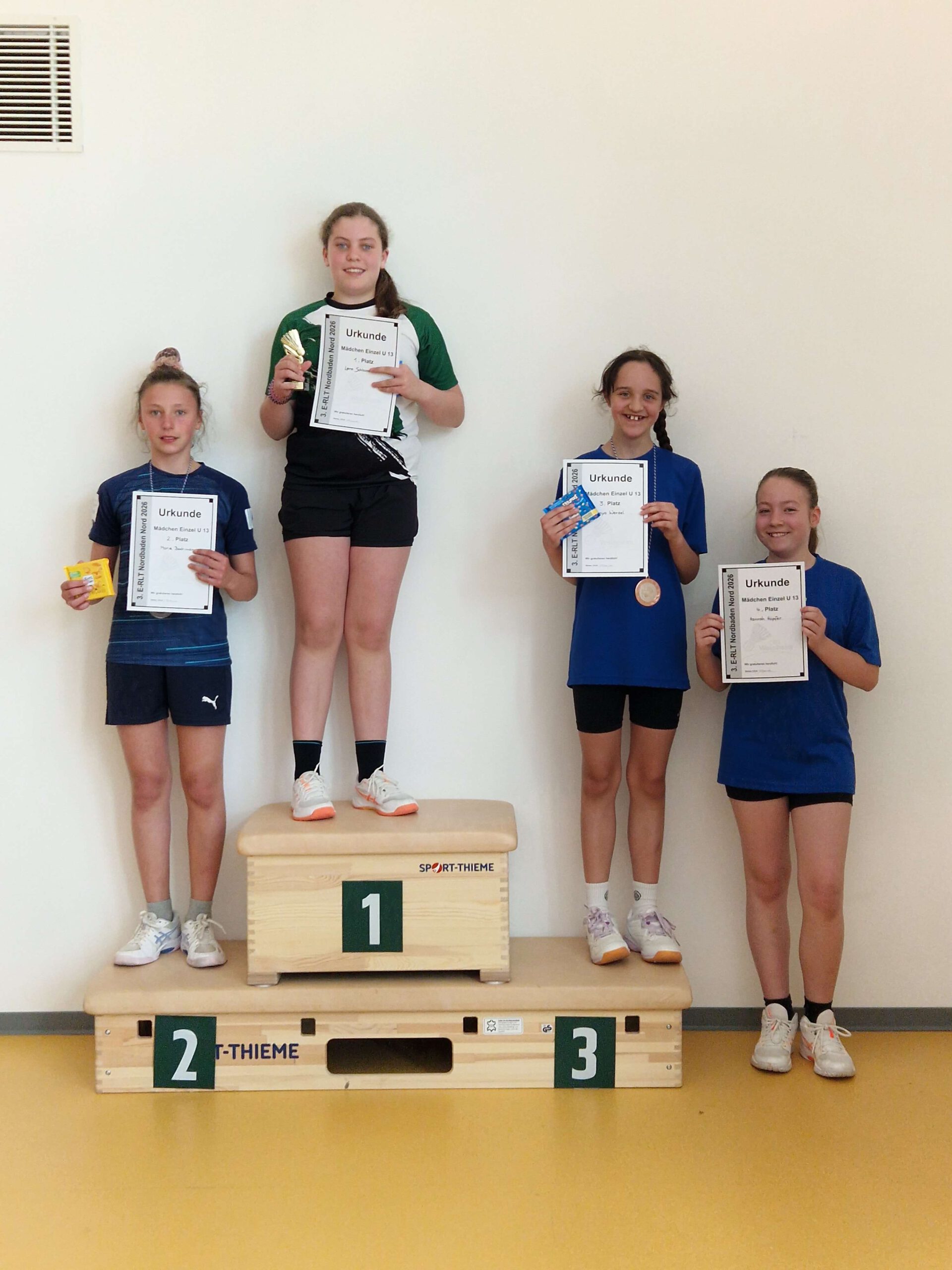 ![]() | ME U13 1 Lena Schlossarek BSpfr. Neusatz 2 Marie Bachmann 1. BC Sbr.-Bischmisheim 3 Lenya Wenzel SG Hemsbach 4 Hannah Höpfer SG Hemsbach |